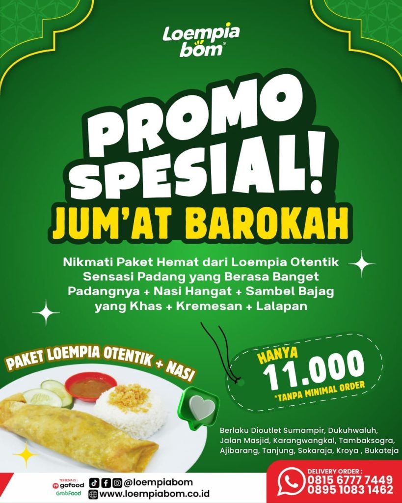 Promo Jumat Barokah adalah penawaran paket hemat yang berlaku setiap hari Jumat di outlet tertentu Loempia Bom.